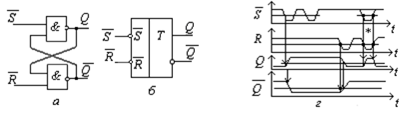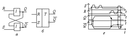 Рис. 3.6. RS-триггера на элементах И—НЕ : а) функциональная схема; б)условное графическое изображение; г) временные диаграммы работы