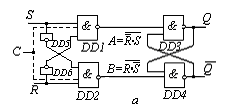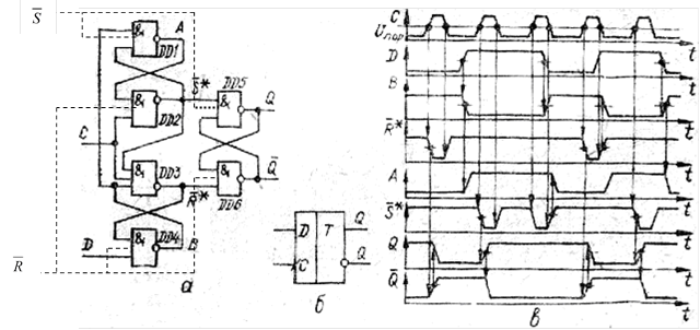 Схема, реализующая E-триггер в базисе логических элементов И—НЕ, и его временные диаграммы показаны на рис. 3.9. Дополнительные инверторы DD5, DD6 при S=R=1 блокируют сигналами