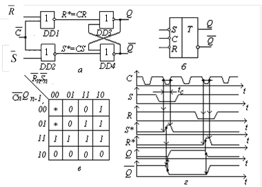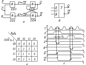Рис. 3.11. Синхронный RS-триггер на элементах И—НЕ:а)функциональная схемы; б) условное графическое изображения; в) карта Карно; г) временные диаграммы работы