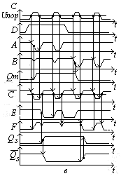 Вследствие задержки блокирующих сигналов инверторами DD5, DD6 на выходах вентилей DD1, DD2 формируются сигналы помехи дA, дВ, аналогично помехам в асинхронных триггерах типа R и S. Помехи на управляющих входах при определенных условиях могут привести к ложному срабатыванию триггеров на элементах DD3 и DD4.