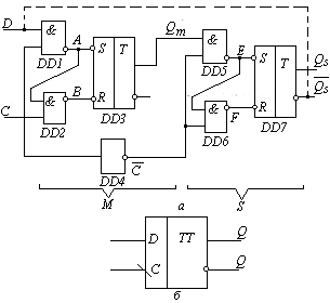Как видно из рис. 3.3, двухступенчатый триггер обозначается двумя буквами ТТ. Двухступенчатые триггеры часто называют также триггерами типа MS (от английского Master-Slave, т. е. хозяин — раб). Эта аббревиатура отражает характер работы триггера: входная ступень вырабатывает новое значение выходной переменной Q, а выходная его копирует.