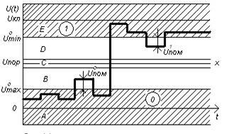 В пределах используемой элементной базы должна быть обеспечена совместимость входных и выходных сигналов по амплитудно-временным параметрам. Это подразумевает единство правил дискретизации входных и выходных сигналов с учетом их естественного разброса. На рис.1.7. показаны типичные области для двоичного сигнала. Здесь A, E — области допустимых значений соответственно нулевого U0 и единичного U1 уровня сигнала, В, D — области допустимых помех U0 пом и U1 пом на уровне «0» и «1», С - область допустимых значений порогового напряжения U1 пор, при котором происходит переключение элемента.