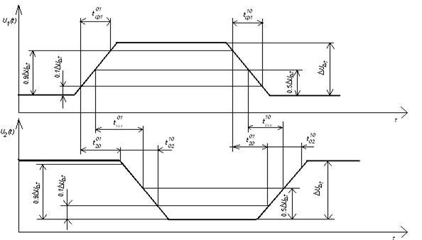 Длительности фронтов переключения сигнала из состояния «1» в состояние «0» и наоборот (измеряются на уровне 0.1-0.9 перепада напряжения между уровнями U1 – U0= ΔU ) – tф 01 и tф 10;