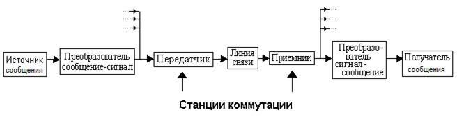 В рассмотренной выше схеме передатчик и приемник могут рассматриваться как станции коммутации. В качестве линий передачи выступают двухпроводные соединительные линии между станциями. Станции коммутации являются обязательным элементом простейшей телекоммуникационной сети, рассмотренной ниже.