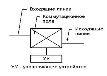 · управляющее устройство (УУ), обеспечивающее установление соединения между входящими и исходящими линиями через коммутационное поле, а также прием и передачу управляющей информации.