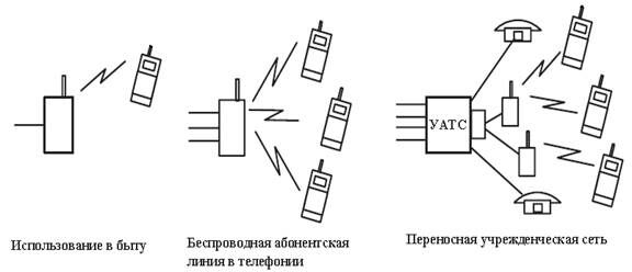 Беспроводные телефоны были первоначально созданы для рынка жилых районов, а точнее они были разработаны, чтобы покрыть только одну местную область, типа дома и сада. Они поддерживают только ограниченную подвижность абонентов и их нельзя считать конкурентами для сотовых систем мобильной связи. Мы рассмотрим самые важные применения радиотелефонов.