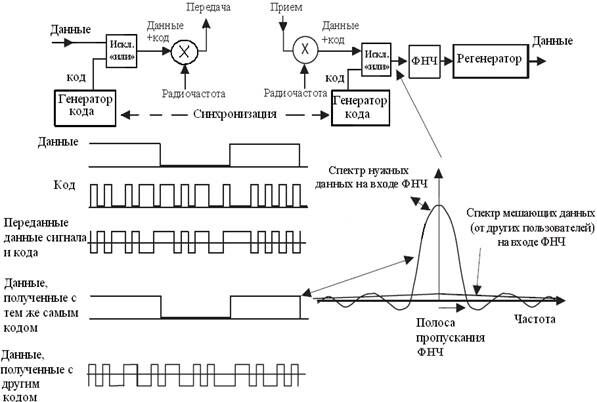 В передатчике над пользовательскими данными и стелющимися кодовыми данными выполняется логическая операция «исключающее ИЛИ» или суммирование по модулю 2. Суммирование по модулю 2 означает: 0Å0=0; 0Å1=1, 1Å0=1; 1Å1=0. Другими словами, операция «исключающее ИЛИ» дает на выходе 1 (высокий уровень), когда пользовательские и кодовые данные не совпадают (разные), и дает на выходе 0 (низкий уровень), пользовательские и кодовые данные совпадают. В нашем упрощенном примере, биты кода, которые далее будем называть просто «кодом», и биты информационных данных, которые для простоты назовем «данными», после суммирования по модулю 2 дадут биты в 10 раз короче, чем биты оригинальных данных. Известно, что чем короче импульсы, тем шире спектр они имеют. Таким образом спектр каждого бита информационных данных стал после суммирования с кодом в 10 раз более широким, т.е. спектр информационных данных занял теперь в 10 раз более широкую полосу частот. После модуляции несущего колебания, которое используется как переносчик сигнала, широкая полоса частот будет занята и радиосигналом CDMA, который излучается антенной.