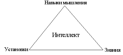 Интеллект — одно из самых противоречивых и в тоже время  основополагающих понятий в теории мышления, поскольку интеллект — это «вещество» мысли. Его можно принять за сырье, из которого сделаны мысли. Трудно представить себе ситуацию, которая не требовала бы использования интеллекта. Термин «интеллект» употребляется в разговорном языке очень широко, а именно как синоним ума или рассудка. Обычная  структура интеллекта включает в себя три компонента: установки, навыки мышления и знания, см. рис.2.3.