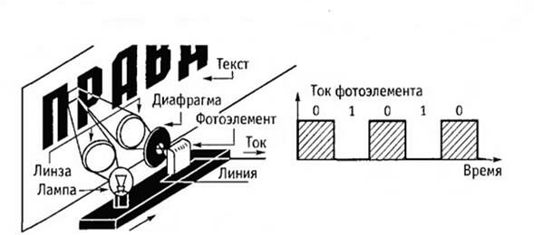 При условном преобразовании связь между информационными параметрами сообщения и сигнала - условная. При этом применяются коды, т. е. каждый знак сообщения при передаче преобразуется в определенную комбинацию электрических импульсов, а в процессе приема по этой комбинации определяется соответствующий знак. Коды используются для преобразования оптических сообщений в сигнал. Примером служит принцип действия факсимильного аппарата.