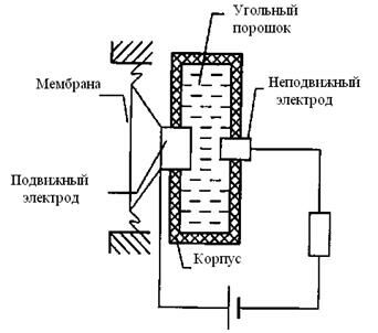 Простейший преобразователь этого типа - угольный микрофон. Основными элементами микрофона являются подвижный и неподвижный электроды, подключенные к электрической цепи, и угольный порошок, заполняющий пространство между электродами. Подвижный электрод жестко связан с мембраной, воспринимающей колебания окружающего слоя воздуха. Элементы микрофона помещены в общий корпус, изготовленный из изоляционного материала.