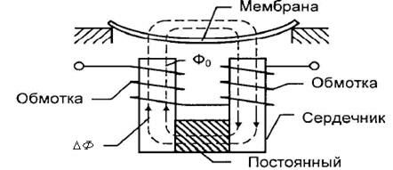 , создаваемых соответственно постоянным магнитом и электромагнитом. Под действием результирующего (суммарного) потока мембрана телефона совершает колебательные движения, совпадающие с направлением электрического тока, поступающего в обмотку электромагнита.
