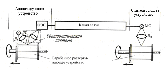 Рис. 5.8. Структурная схема факсимильной связи: ИС - источник света, Л - линза, ФЭП – фотоэлектрический преобразователь, МС - модулятор света.
