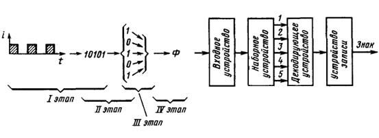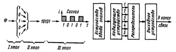 третий — последовательное преобразование элементов комбинации в электрические импульсы (посылки) и передача их в канал.