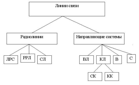 Направляющие системы делятся на воздушные линии (ВЛ), кабельные линии (КЛ), волноводы (В) и световоды (С). Кабельные линии делятся на симметричные кабели (СК) и коаксиальные кабели (КК).