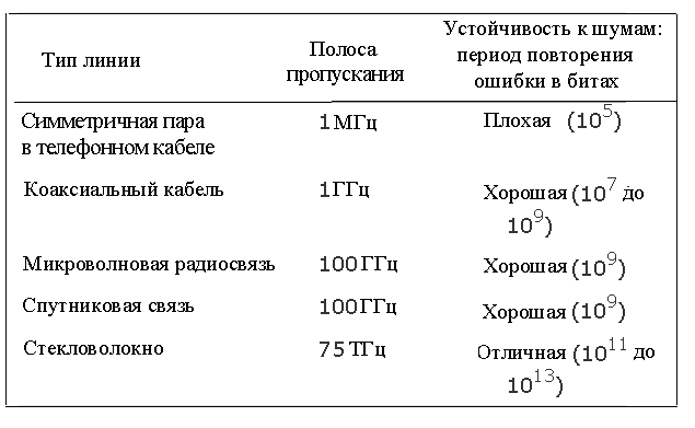 Другой важнейшей характеристикой линий связи является чувствительность к шумам и соответственно высокий темп ошибок при передаче цифровых сигналов. Наибольшей чувствительностью к шумам и внешним воздействиям обладают симметричные пары. У коаксиального кабеля и стекловолокна чувствительность к шумам и внешним воздействиям на порядок меньше, что объясняется более удачной конструкцией. У радиолиний темп ошибок определяется условиями передачи: погодой, наличием препятствий в виде листвы и зданий. Основные характеристики линий связи приведены в таблице ниже.