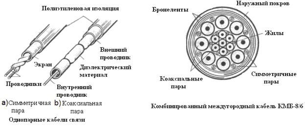 Направляющие системы, образованные проводами с изоляционным покрытием и помещенные в специальную защитную оболочку, называются кабельными линиями (КЛ) или просто кабелями связи. По конструкции и взаимному расположению проводников однопарные кабели делят на симметричные (СК) и (несимметричные) коаксиальные (КК). Основными элементами кабелей являются пары медных проводов, каждая из которых образует физическую цепь для передачи сообщения. В симметричных кабелях пара образуется с помощью одинаковых по конструкции изолированных проводников. В парах коаксиального кабеля один из проводников сплошной и вложен внутрь другого, полого.