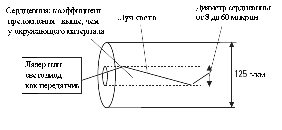 Сигналы связи для передачи в световоде переносятся в оптический диапазон частот (сто террагерц). Принцип распространения светового луча вдоль стекловолокна показан на рисунке. Луч распространяется по сердцевине волокна за счет последовательного и полного отражения от её границы с оболочкой. Для этого коэффициент преломления света у сердцевины должен быть немного больше, чем у оболочки.