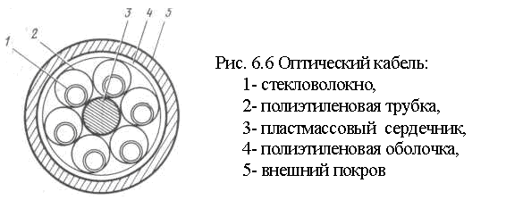 В оптическом кабеле стекловолокна свободно помещаются внутри полиэтиленовых трубок, скрученных вокруг прочного пластмассового или металлического сердечника.