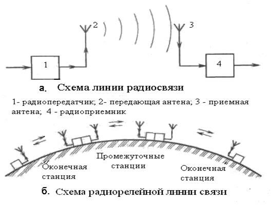 В линии радиосвязи используются радиопередатчик и радиоприемник с антеннами. Подлежащий передаче сигнал преобразуется передатчиком в радиоволну, которая излучается в свободное пространство. Эта волна принимается антенной радиоприемника и преобразуется сначала в первичный сигнал, а затем в сообщение. Протяженность линии радиосвязи и возможное число сигналов, передаваемых по ней, зависят от многих факторов: диапазона передаваемых частот, атмосферных условий, технических данных передатчика, приемника и антенн.