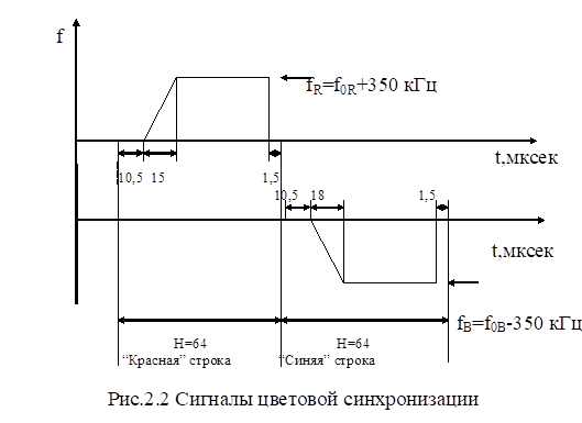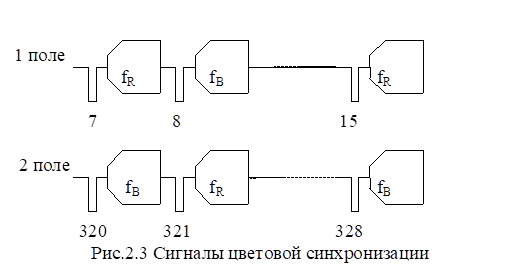 Сигналы цветовой синхронизации (опознавания строк) представляют собой пакет цветовых поднесущих, модулированных импульсами трапецеидальной формы. На рис.2.2 показано изменение частоты сигналов опознавания. Сигналы опознавания передаются только во время гасящих импульсов полей и занимают строки с 7 по 15 в нечетных полях и с 320 по 328 в четных полях. На рис.2.3 показана форма сигналов опознавания для первого и второго поля первого (нечетного) кадра. Сигналы расположены между синхроимпульсами строк.