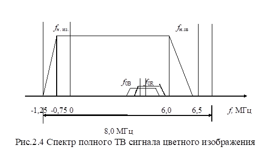С учетом вышеизложенного, спектр полного телевизионного сигнала цветного изображения имеет вид, представленный на рис.2.4.
