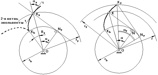 Эвольвента образуется путем перекатывания производящей прямой KyNy без скольжения по основной окружности радиуса rb.