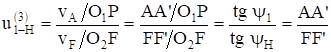 Зададимся отрезком АА’, который изображает линейную скорость колеса 1 в точке А. Т.к. колесо 1 вращается вокруг О1, то закон распределения линейной скорости по первому звену изображается прямой линией О1А’. Сателит 2 в т.А имеет такую же линейную скорость, что и колесо 1. В т.С сателит 2 имеет МЦС в абсолютном движении, т.к. идет контакт с неподвижным колесом 3. Закон распределения линейной скорости по второму колесу изображается прямой линией СА’. В т.В сателит имеет линейную скорость, которая изображается отрезком ВВ’, однако т.В является также и осью водила Н, которое вращается вокруг О2. Следовательно, закон распределения линейной скорости по водилу изобразиться прямой линией О2В’. Для точки F водила линейная скорость изображается отрезком FF’.