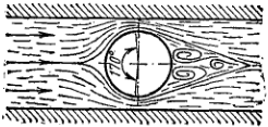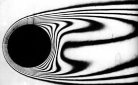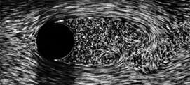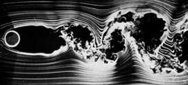 | Фото обтекание круглого цилиндра при Re=10000, В верхней части цилиндра сформировавшийся ламинарный слой разрушается, затем он отрывется и образуется турбулентный след. |