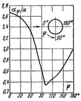 Рис. Изменение коэффициента теплоотдачи по периметру сечения цилиндра при поперечном обтекании и Re =2-5•105.