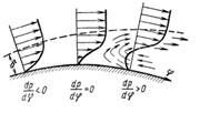 Рис. Распределение скоростей у поверхности цилиндра и образование возвратного течения. |