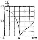 На рис. 12.9 показано изменение коэффициента тепло­отдачи по периметру трубы. По вертикали отложено от­ношение местного значения коэффициента теплоотда­чи а к среднему по окружности аСр-