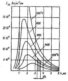 Законы Планка и Стефана — Больцмана были установлены для абсолютно черного тела. Зависимость интенсивности излучения от температуры и длины волны для реальных тел может быть установлена только на основе опыта. Экспериментальные данные для большинства твердых тел показывают, что кривая h=f{X) непрерывна