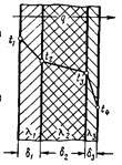 Согласно решению для плоской однослойной пластины q= (t1-t2)/(d1/l1)= (t2-t3)/(d2/l2)= (t3-t4)/(d3/l3)