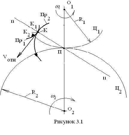 Свяжем с центроидами профили Пр1 и Пр2 так, чтобы они касались друг друга в точке К. Относительная скорость точки К1 профиля Пр1 по отношению к совпадающей с ней точке К2 профиля Пр2, (в данный момент обе точки находятся на нормали n–n в точке K) обозначена на рис.3.1 как Vотн. Докажем следующие два положения: 1). Вектор