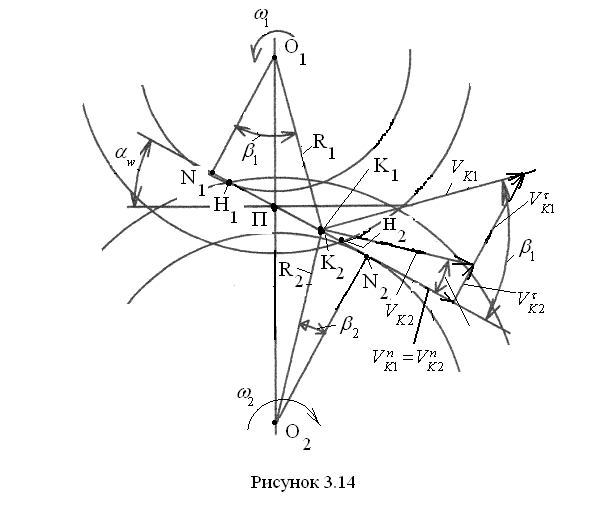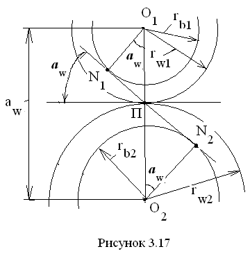 Для вывода формул обратимся к рис. 3.17, на котором показаны необходимые элементы зацепления. Линия зацепления N1N2 образует угол зацепления αw с общей касательной к начальным окружностям радиусов