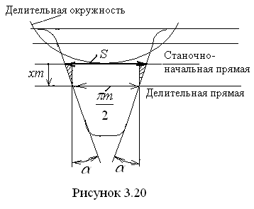 Толщина зуба колеса по делительной окружности определяется шириной впадины инструментальной рейки по станочно-начальной прямой (Рис.3.20), которая при изготовлении колеса перекатывается по его делительной окружности без скольжения.