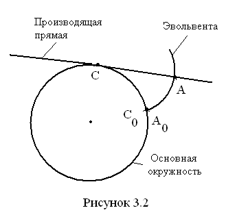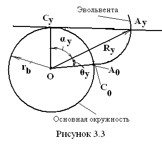 Для получения уравнения эвольвенты обратимся к рис. 3.3. Положение произвольной точки Ay эвольвенты в полярной системе координат определяется двумя координатами относительно её начального радиус-вектора OA0 (или OC0):