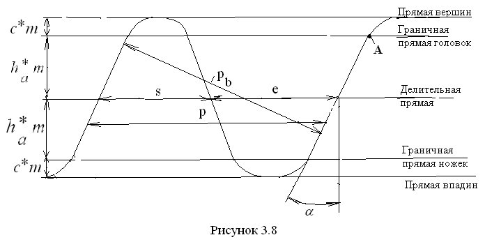 Часть контура выше делительной прямой называется головкой, ниже – ножкой исходного контура. Таким образом, делительная прямая делит зуб исходного контура на головку и ножку. Как видно из рис. 3.8, прямолинейная часть профиля мсходного контура заключена между граничными прямыми, параллельными делительной прямой. Эти прямые отстоят от делительной на расстояние