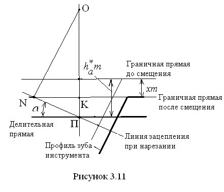 , так как они представляют собой величину смещения инструмента от центра колеса при его нарезании, что, по существу, равно расстоянию между делительной и станочно-начальной прямыми. Каждый горизонтальный катет прямоугольного треугольника равен