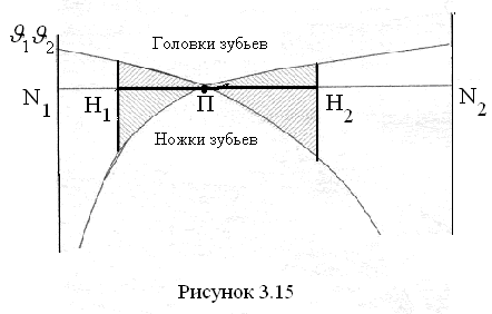 3) Правильное зацепление эвольвентных профилей происходит только в пределах линии зацепления N1N2, так как только в этих пределах контактирующие эвольвентные профили имеют общую нормаль.