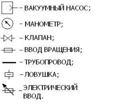 Типовая вакуумная установка включает в себя вакуумную камеру, насосы, соединительные трубопроводы, вакуумные затворы и средства контроля вакуума. Стандартами приняты следующие условные обозначения элементов вакуумных систем, рис 1: