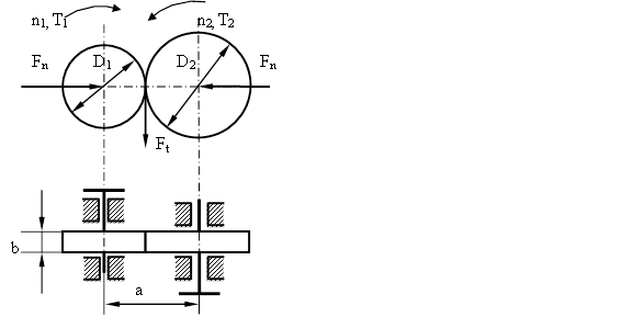 Схема простейшей нерегулируемой передачи изображена на рисунке. Она состоит из двух катков с гладкой цилиндрической поверхностью, закрепленных на параллельных валах.