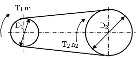 Схема ременной передачи изображена на рисунке. Передача состоит из двух шкивов, закрепленных на валах, и ремня, охватывающего шкивы. Нагрузка передается силами трения, возникающими между шкивами и ремнем вследствие натяжения последнего.