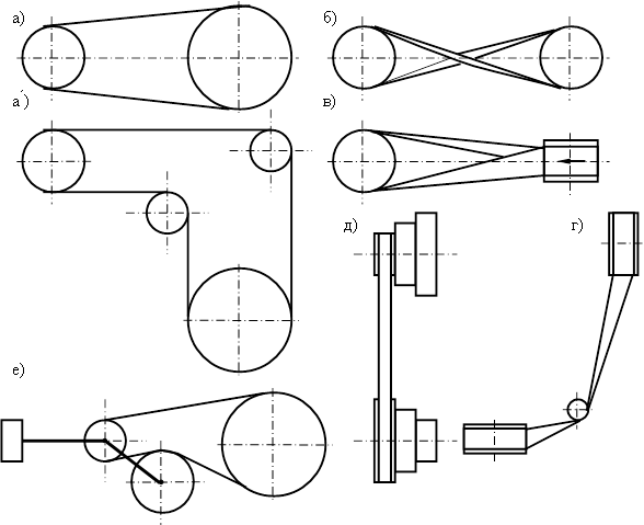 ж) самонатяжные ременные приводы, которые меняют натяжение ремня пропорционально нагрузке. Применяются для небольших межосевых расстояний, значительных передаточных числах и малых диаметрах шкивов.