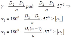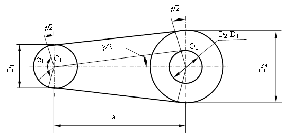Для проектирования ременной передачи необходимо знать a1- угол обхвата на малом шкиве, g - угол между ветвями ремня, L – длину ремня, а- величину межосевого расстояния.