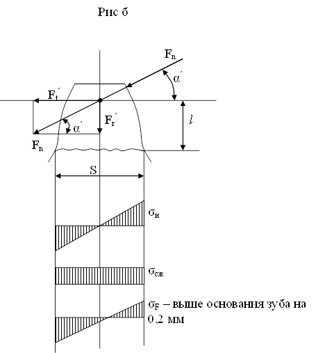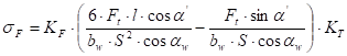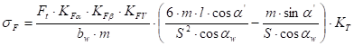 За расчетное напряжение принимают напряжение на растянутой стороне зуба, т.к. здесь возникают трещины усталости. Опасное сечение расположено выше основания зуба приблизительно на величину 0,2m (m – масса). Напряжение изгиба в опасном сечении σF: