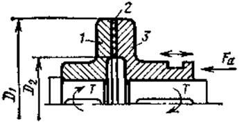 Схема простейшей дисковой муфты  с одной парой поверхностей трения изображена на рис 1. Здесь полумуфта 1 укреплена на валу неподвижно, а полумуфта 3 подвижна в осевом направлении, 2 – фрикционная накладка. Для соединения валов к подвижной муфте прикладывают силу Fа. Момент трения Тт определяют по формуле: