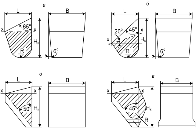 Ковши элеваторов. Разнообразие физических свойств транспортируемого материала обусловливает необходимость применения в элеваторах различных по форме ковшей. Конструкции ковшей также определяются и способами их загрузки и разгрузки. Основные параметры (рис. 15.2) – ширина B, м; вылет L, м; высота Hк, м; радиус скругления днища R, м; объем или емкость по оси x-x i, л. Всего предусмотрено четыре типа ковшей.