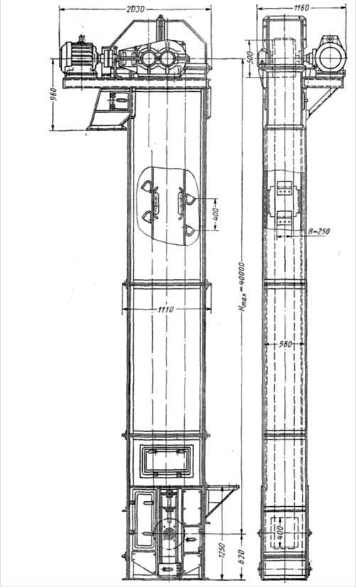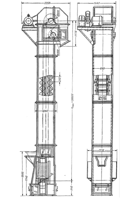Рис. 15.9. Элеватор цепной тихоходный с сомкнутыми ковшами со скругленным днищем ЦС-320
