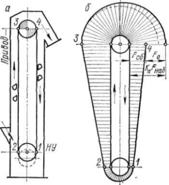 Рис. 15.11. Вертикальный элеватор: а – расчетная схема; б – диаграмма натяжений тягового органа